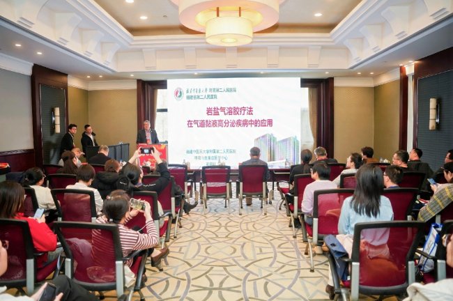 专题会的核心内容来自著名呼吸病学专家赖国祥教授的精彩分享。赖教授从病理生理学基础、作用机制、临床研究证据及临床病例分享等多个维度,对岩盐气溶胶疗法进行了系统而深入的阐述。他介绍,岩盐气溶胶疗法作为一种非药物、非侵入性的物理治疗手段,通过岩盐气溶胶治疗仪将专用岩盐配料高速研磨生成1-5μm的干性微粒,可随呼吸深入气道各层级,通过抗炎抗菌、负电荷刺激纤毛摆动、稀释痰液、促进排痰等多重机制,有效改善气道通畅性,缓解患者症状。