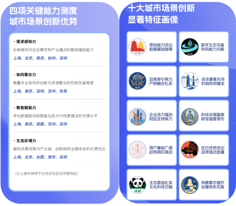 本次指数测评选取了南京、合肥、杭州、北京、上海、广州、深圳、武汉、成都、重庆十个代表性城市作为样本。《报告》结果显示,十大城市的场景创新实践各具特色,总体呈现出由“资源驱动”向“场景牵引”的系统性跃迁。