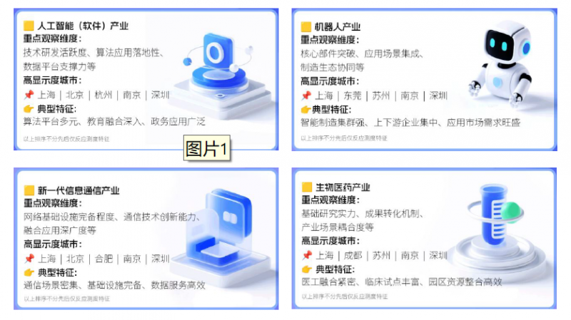 为进一步聚焦产业前沿,《报告》从场景创新视角出发,选取了人工智能(软件)、机器人、生物医药、新一代信息通信四大重点产业,从场景支撑能力、场景生态协同、场景技术赋能、场景转化成效4个基本维度构建“产业城市画像”,清晰揭示了不同城市在特定产业赛道上的优势与特点。