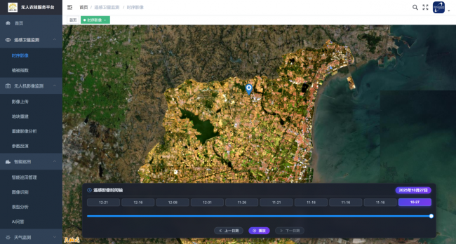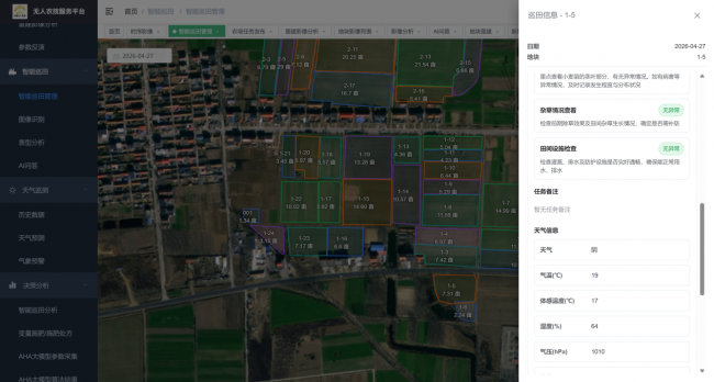 针对卫星影像细节不足的短板,平台搭配无人机巡检模式补足精细化监测能力。凭借高分辨率成像优势,近距离采集田间画面,精准捕捉单块田块的作物疏密、幼苗存活情况、局部杂草滋生、轻微病虫害、田间设备破损等细微问题。聚焦单区域种植细节,弥补宏观遥感监测的细节漏洞,实现农田“宏观全覆盖、细节无遗漏”,让田间隐性种植问题早发现、早预警。