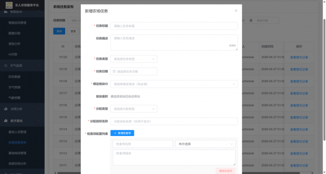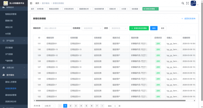 通过大晓智能无人农技服务 Web 管理平台,农场主及管理人员可实现人员统一管控,同时面向本地农事操作人员在线下发各类田间作业任务。系统可明确任务指标、完成时限与详细作业要求,任务内容清晰具象、权责明确,实现农事任务标准化、线上化高效统筹。