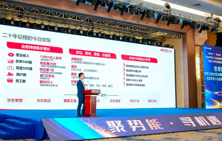 “聚势能·寻机遇·共未来”2026年钢铁工业品采购供应链合作大会暨设备(备件)供应商招募展洽会日前在河北唐山举行,京东工业在大会上发表主题演讲,向超200家河北钢铁行业代表性企业介绍了京东工业领先的数智供应链、高效履约、全品类物资保障服务,同时展示自有品牌惠象产品核心优势。会议期间,京东工业与大河汇鑫(河北)供应链有限公司(以下简称“大河汇鑫”)签署合作协议,携手通过供应链数智化升级,助力钢铁行业全链路提质降本增效。