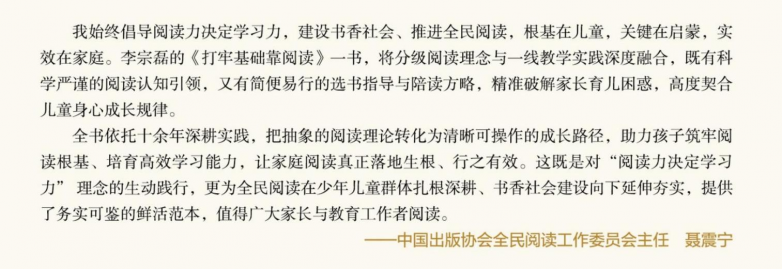 全民阅读的根基在家庭,关键在青少年。在全民阅读向纵深推进的新时代背景下,《打牢基础靠阅读——儿童阅读有方法》的出版,不仅为万千家庭提供了一套科学、可落地的青少年阅读与家庭阅读系统解决方案,更呈现了一套民间力量参与全民阅读推广的可复制实践样本。