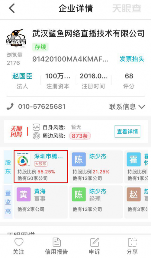 根据天眼查上显示,腾讯通过55%的控股权让大鲨鱼变成了小企鹅。