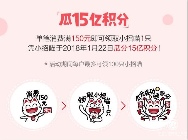 今年,恰逢招行信用卡发卡15周年,在去年口碑加持基础上,15周年特别版“10元风暴”活动再次升级,除了传统的10元兑换礼品,今年更是首次推出“瓜15亿积分”活动。持卡人只要单笔消费满150元,即可在掌上生活App领取1只可爱的小招喵。活动期间,持卡人可不断累积小招喵数量(每户最多可领取100只),并最终凭领取的小招喵于2018年1月22日参与瓜分15亿积分。小招喵领得越多,可瓜分的积分也越多。