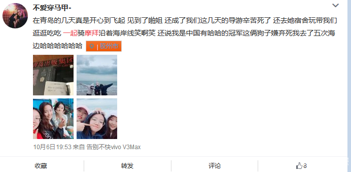网友@不爱穿马甲微博分享道:“在青岛几天真的是开心到飞起,一起骑摩拜沿着海岸笑啊笑,还说我们是中国有嘻哈的冠军。”有摩拜和好友的时光,总不会寂寞。