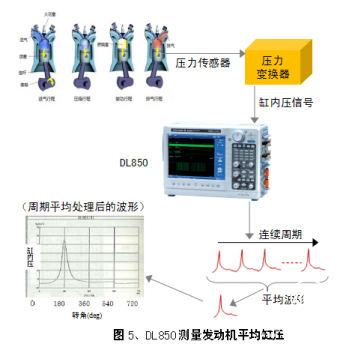 使用示波记录仪DL850可以测量很多发动机参数,如缸内压力、曲轴转角、喷油时间、温度等,通过周期平均功能对上千个周期的发动机缸压信号进行平均,获得平均缸压曲线。