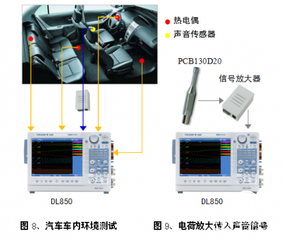 使用DL850检测可以车内温度、噪声等指标,并进行较长时间的记录。噪声的检测需要使用声音传感器,并通过电荷放大器将噪声信号传输至DL850。