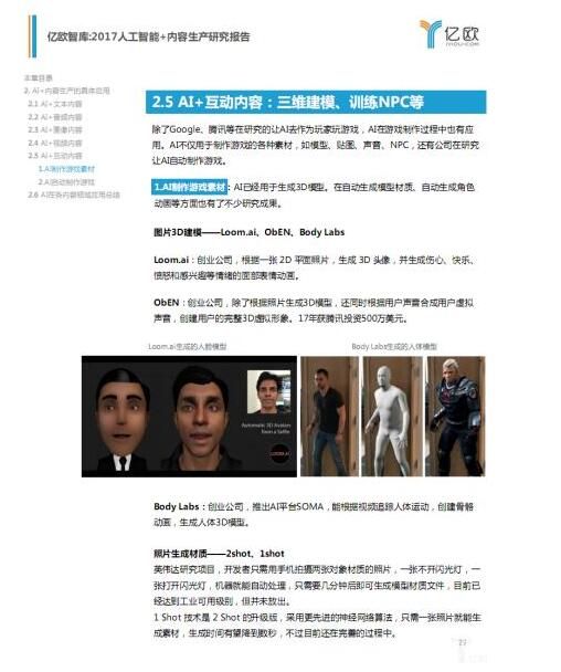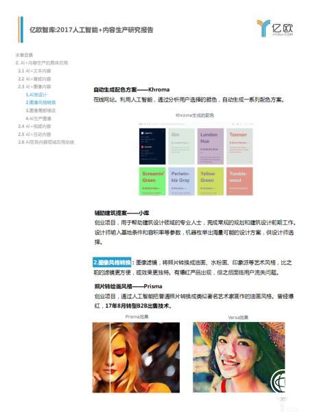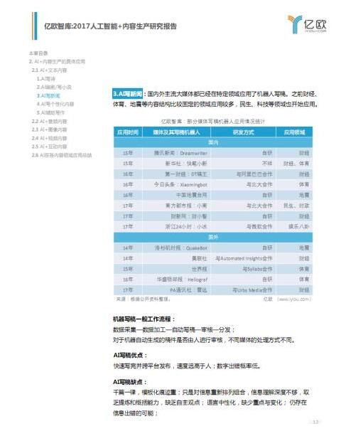 为了弄清AI+内容生产进行到何种程度,对内容生产可能产生何种影响,亿欧智库撰写了这份《2017 人工智能+内容生产研究报告》,对目前AI在内容生产领域的应用进行了研究,分析了AI在文本、音频、图像、视频、互动内容五大领域的具体应用情况,展望了AI在内容生产中应用的发展趋势,供相关人士参考。