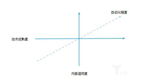 相当长一段时期内,AI在小部分领域能够实现自动生产内容,在大部分领域,AI更适合于与人协作。在于人协作的过程中,机器可能会完成大部分机械重复工作,人完成小部分创造性工作。AI能否应用,是机器换人还是人机协作,与内容适用度和技术成熟度两个关键因素相关,技术成熟度高、内容适用度高的领域,AI将先得到应用,且自动化程度高。技术成熟度低、内容适用度低的领域,AI较晚应用,自动化程度低,人的参与程度高。