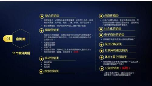 第9届金鼠标设置案例类、公司类、人物类、团队类、广告主类、系统/工具/平台类6大类别。案例类新增视频创新营销类,对当下在直播以及短视频行业创新应用的营销案例进行表彰。特别增加公益营销类,主要表彰以数字渠道为核心,通过公益活动与消费者进行沟通的品牌营销案例。