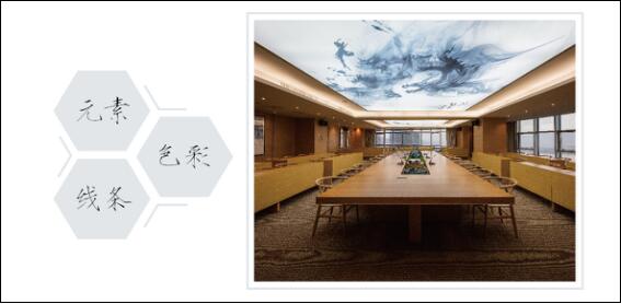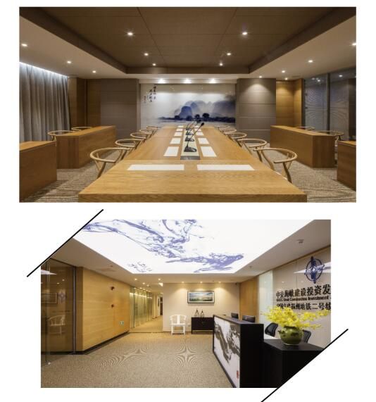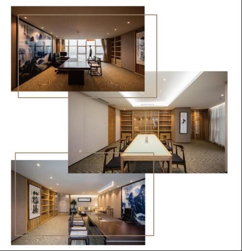 空间全案采用了原木色的木饰面,家具。整个空间浑然一体,统一的原木色应用,会给人生态温馨的办公氛围。木本宜居,在这样的空间里长时间也不会感觉环境压抑。在这个干净色彩的基础上,设计师加入了墨蓝色的水墨元素,在会议大厅的顶部设计和办公室的装饰画上都均有设计这样的元素相呼应。不仅是突出了企业的性格风采,墨蓝色与原木色的结合,让整个办公设计作品更加出挑。