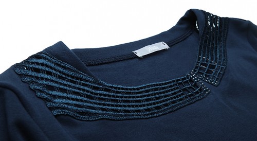 说到美观,不厚重当然只是一个方面,时尚的外观设计当然也是很有必要的。这款上衣的整体设计构思简约大气,易于搭配各类外衣的圆领设计,在领口位置上还拼接了镂空的不对称刺绣几何花片。虽然看似随意的花片实则是爱慕的精心放置。再加上水钻的点缀,让暖衣更加凸显其时尚的设计品味,也为穿着者的冬日,增添了一笔精致的温暖。