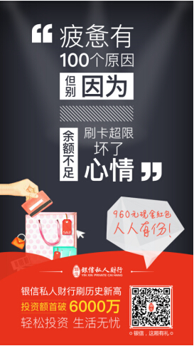 据了解,为了再次感谢投资者们的投资热情,银信私人财行在年底将加大优惠活动的力度,特推出的‘960元新手注册红包’、‘礼溢金秋 一路有礼——爆款手机大派送’等福利活动,深受投资者的欢迎。可见,一家以客户利益为主的网贷平台,才是真正的用‘心’在服务!