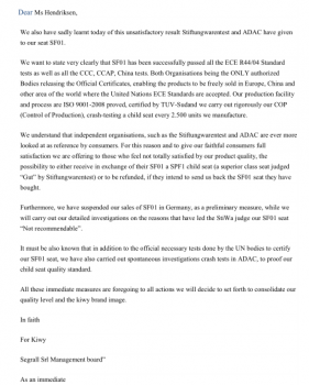 ADAC说SF01不推荐安装,实际情况是在测试过程中安装方式不对,导致测试结果不具参考性。SF01哈雷卫士正确的安装方式应该是插好isofix硬接口,同时用汽车安全带固定座椅,要双重固定,增加安全系数。而ADAC在做碰撞测试的时候,并不清楚这才是正确的安装方式。通过kiwy和德国ADAC总部沟通的记录,可以了解。