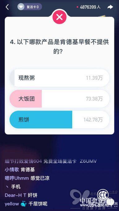 当然,此次西瓜视频《百万英雄》的这种合作模式已经不是第一次了,之前和肯德基的合作,也是相当成功,同样也是将广告植入题目之中:以下哪款产品是肯德基早餐不提供的?正确答案是煎饼。很多网友表示,对不起吃了很多年的肯德基爷爷,同时也让肯德基早餐这几个关键字,一时间成为热门搜索标签。