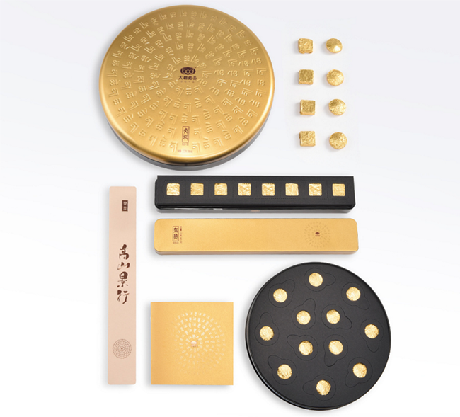 在一番考察深思熟虑过后,古格王朝选取了佛教信徒敬仰的玛尼石与转经筒为创意原点,取玛尼石上经文排列之形,将其内容换成“大相”之藏文字体,经修饰后成为核心元素。取转经筒之金色与轮形,将青藏文化简洁大气的展现在包装上,犹如不停转动的转经筒,易于消费者认知和记忆,又不失高端王室藏茶的王者风范。