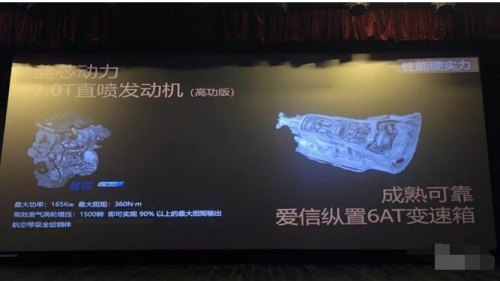 动力搭载一台代号为20L4E的蓝芯动力2.0T直喷发动机,最大功率为最大功率165Kw,最大扭矩360N·m。传动系统方面,匹配来自爱信纵置6AT变速箱。