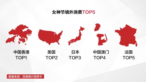 招行信用卡统计发现,女神节期间,境外消费最高的地区排名前五依次为:中国香港、美国、日本、中国澳门、法国。去境外游玩、购物已成为女性休闲享受、犒赏自己的不二选择。
