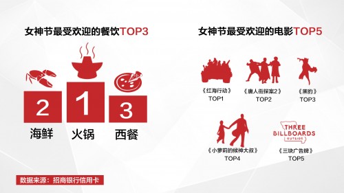 女神节期间,无论是和男友约会,还是陪闺蜜逛街,在属于自己的节日里,享用美食必不可少。招行信用卡数据显示,火锅、海鲜及西餐成为女性消费者犒劳自己的首选,较去年相比,中高端餐饮增长明显。其中,西安的汉来海港自助、宁波的牛很鲜火锅、成都的雍容荟海鲜纷纷上榜,成为女性青睐的美食。