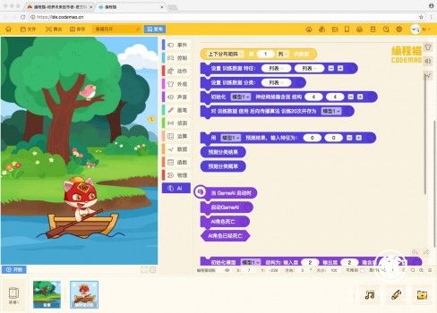 在参观过程中,编程猫工作人员向大使和芬兰代表团展示了自主研发的图形化编程平台和课程内容。其中涉及到的云变量和AI学习积木令肃海岚大使十分震撼,工作人员介绍道,通过云变量,独立的编程作品都可以在云端存储数据,它意味着,每一个作品都不再是一座孤岛。而使用AI学习积木,孩子能创作出可以通过人工智能算法进行自主学习的智能游戏角色。这种AI学习积木教学嵌套在游戏化教学与PBL项目制教学的方式中,让抽象复杂的人工智能算法具像地体现在游戏角色学习如何玩游戏上。