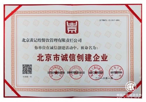 可以说,诚信已经成为黄记煌品牌管理的灵魂。本次获得“北京市诚信创建企业”荣誉,也只是黄记煌所获得的与诚信有关的奖项之一,据了解,其成立不久就曾获得“中国食品安全最佳诚信火锅餐饮品牌”的称号,2015年,黄记煌还被商务部授予“诚信经营示范单位”。去年年底,黄记煌荣获了 “AAA级信用企业”认证,成为被行业认可的信用企业。