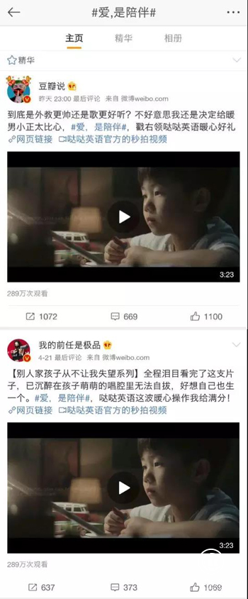 什么是城市父母在子女教育中最大的痛点?当忙碌的工作挤占了本该陪伴孩子的时间,当繁杂琐碎的日常打扰了陪伴孩子的情绪,这些在城市中扮演精英白领角色的爸爸妈妈们,一直愧疚于缺席孩子的成长和教育。在深刻洞察80、90后城市父母痛点的基础上,主打“一对一固定外教”在线教学模式的哒哒英语,融入了“陪伴”理念,将本轮传播话题定为“爱,是陪伴”,以情感共鸣深度唤醒目标用户群。而在话题传播上,选择了不同类型的微博红人进行情感传递。