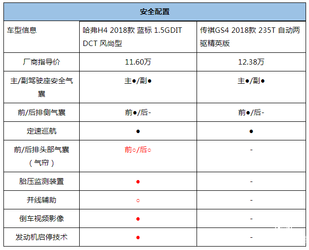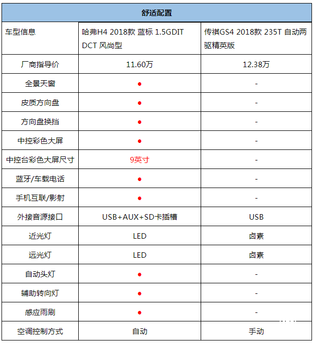 再看传祺GS4,图表中这款车型售价比哈弗H4贵了近1万元,但是配置却比哈弗H4逊色不少, 例如,哈弗H4配备自动空调,传祺GS4则以手动空调为主;哈弗H4有全景天窗,传祺GS4并未配备;哈弗H4有感应雨刷、自动头灯和辅助转向灯,传祺GS4也未搭载……论性价比而言,哈弗H4给予消费者的关怀更胜一筹。