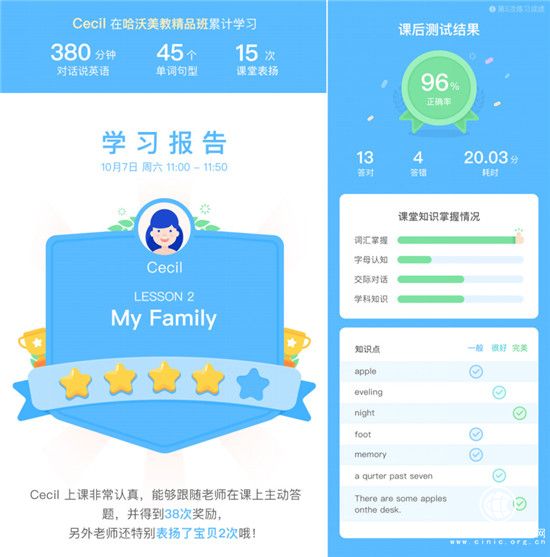 家长可以通过哈沃家长端实时了解孩子课堂表现,如上课视频回放、课堂“小星星”奖励情况及班级排名等;课后家长端也将及时生成专属报告,针对孩子课后作业答题正确率、知识点掌握情况等,给出有针对性的学习和练习建议;此外,家长端还将每月定期向家长推送孩子的阶段性学习测试报告,从词汇、语法、交际、阅读、听力五大维度为孩子英语学习做出精准的阶段性能力分析,让家长第一时间了解孩子的每一次进步。