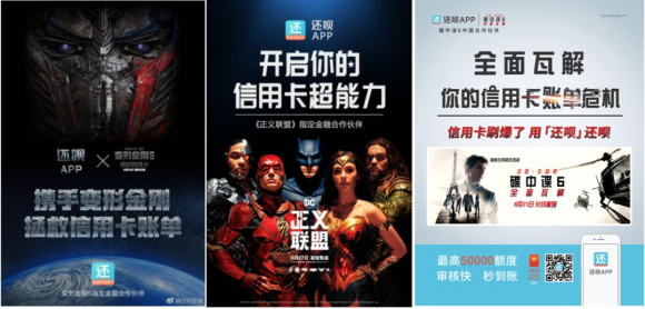 对此,还呗品牌负责人表示,作为一款帮助用户渡过信用卡账单危机,保护信用的金融产品,和同样宣扬正义、安全、值得信赖的“燃”系好莱坞电影合作,还呗希望实现电影IP的价值精神到品牌理念上的自然联想,强化还呗作为“持牌金融机构”带给用户的可信、可靠、可用的心理认同。