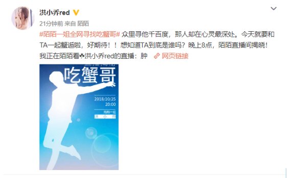 首先,洪小乔在微博上开始了第一轮剧透,声称“吃蟹哥”并不在吃货界,但江湖上却有很多关于他的传说。此言论一出,众多奇葩网友们也开始了脑洞大开的猜想,吃蟹哥的身份更是横跨了网红、明星、商业大佬、体育健将等不同的行业。但作为一个成熟的男人,谁还没几个传说不是?(小编就有)小乔给的这个条件实在是太宽泛,许多网友表示,猜得头都疼了,还是没有头绪。
