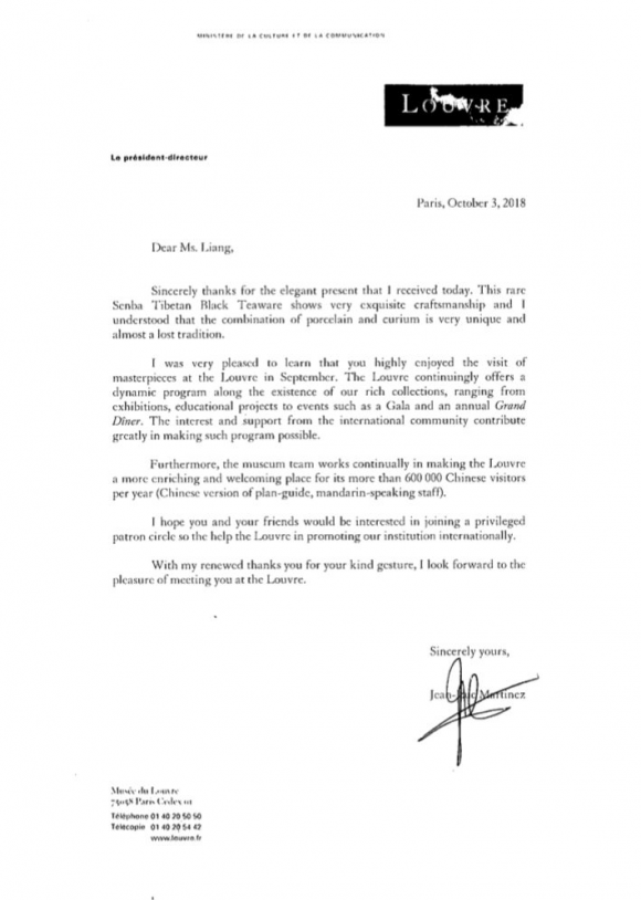 卢浮宫馆长让·吕克·马丁内兹先生亲笔感谢信