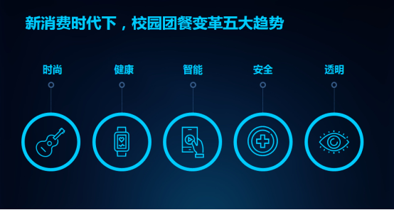 一是更加时尚,校园食堂整体审美已可比肩社餐,风格时尚、个性、多元的食堂走红网络,它们令人们摆脱了传统食堂大锅饭单一、廉价、难吃的印象,取而代之的是多元、品质和美味;二是更加智能,移动端点餐、移动支付、人工智能服务等“黑科技”上阵的智慧食堂引发关注;三是更加健康,随着国家对学生身体素质、营养摄入提出更高的需求,以及学生个人对身材管理的需求,符合健康时尚饮食理念的轻食受到追捧,食堂也更注重学生的营养和健康;四是食品安全上升至国家高度,学生食品安全和营养餐受到全社会的监督;五是后厨更加透明,“互联网+明厨亮灶”现身多个食堂。