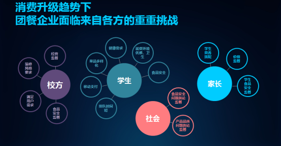 在消费升级的趋势下,团餐企业面临着来自各利益方的不同需求,考验着企业对各个环节的把控能力。从校方角度出发,他们希望食堂的装修风格符合群体审美,对团餐企业的经营状况、食品安全进行严格监督,还肩负着提高用户满意度的责任。从学生角度出发,他们对健康、菜品、卫生、食品安全有要求,希望能获得更加便捷的支付体验,比如手机支付等,最后他们还视时间为金钱,希望缩短排队时间,提升就餐效率。从家长角度出发,他们需要对学生的营养搭配、学生的消费记录、食品安全进行全面监督。从社会角度出发,他们对食品安全、产品品质等十分关注,也需要随时了解执行相关情况,并进行舆论监督。