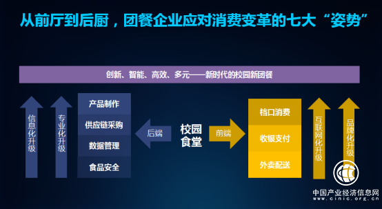 对于团餐企业来说,应对消费变革,满足各方需求,需要对前后端各个环节进行优化。在前端,促进档口消费的品牌化升级、收银支付方面的互联网化升级,并增加营销互动、外卖配送的服务;在后端,促进产品制作的智能化升级、供应链采购和食品安全的专业化升级、数据管理的信息化升级,从而推动传统团餐向更加创新、智能、高效、多元的新团餐迈进。