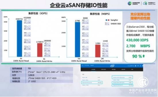 在IO性能方面,采用SSD+机械盘混合部署的3节点超融合集群,单虚拟机单虚拟磁盘的4K随机IO测试IOPS值分别达到了随机读77048;混合随机读写69397,随机写59808;1M顺序IO测试分别达到了读2GB/s;混合读写1.3GB/s,顺序写1GB/s。