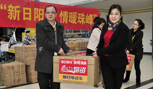 一直以来,新日电动车秉承“有阳光就有新日”的发展理念,广泛地参与社会慈善公益事业,回报社会、造福社会。从“四度情暖西藏珠峰小学”,到“新日阳光,关爱乡村医生”项目启动;从“助力博乐市公安维稳警务巡逻车”,到为外卖小哥打造专属车辆闪电侠,再到现在“西藏质量行——林芝一中援助行动” “母亲健康快车爱心巡诊甘肃行”……据不完全统计,新日自成立19年来,累积向社会捐款捐物价值已逾1亿元人民币。新日电动车先后获得无锡锡山区委授予的“热心参与慈善事业先进单位”,中国红十字基金会授予 的“人道服务杰出贡献奖”,中国扶贫基金会评为的“民生行动先锋”等光荣称号。一个行业的发展需要正能量指引,一个社会的进步需要正能量领航,新日电动车作为行业的领军品牌,引领行业为社会源源不断的输出正能量是新日在履行其肩负的行业使命。