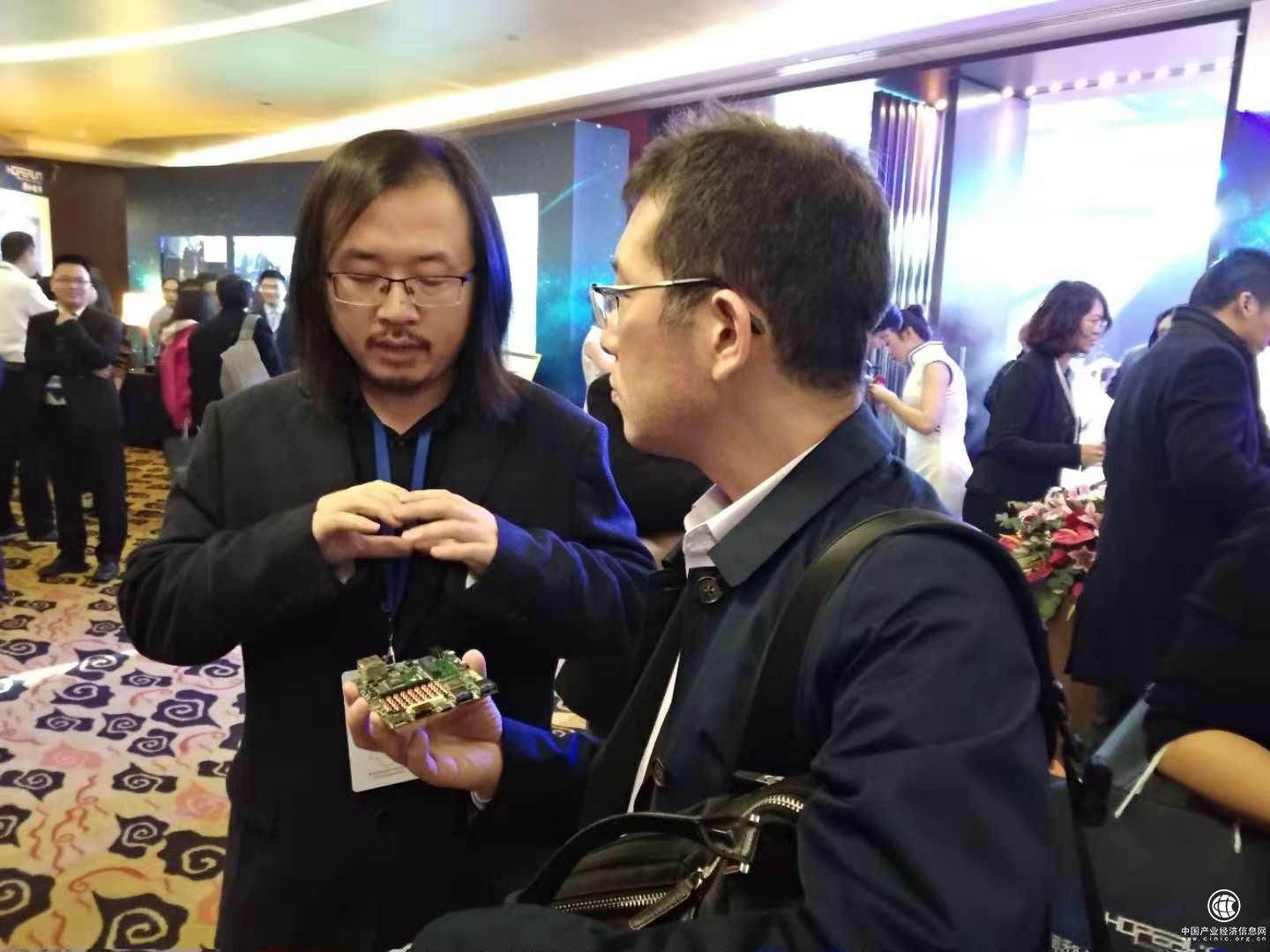 润和软件的AI专家(左)在向到场客户介绍智能芯片