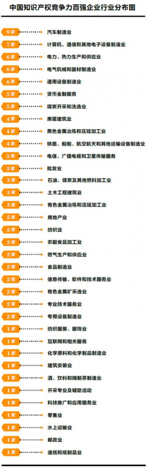 中国知识产权竞争力百强企业分布于35个行业,其中汽车制造业9家;计算机、通信和其他电子设备制造业7家;电力、热力生产和供应业6家;电气机械和器材制造业6家;通用设备制造业6家,这五个行业是百强企业分布最多的行业,总计包括34家企业,占比超过总量的三分之一。汽车制造业成为诞生最多知识产权竞争力百强企业的行业,所包含的知识产权竞争力百强企业达到9家。