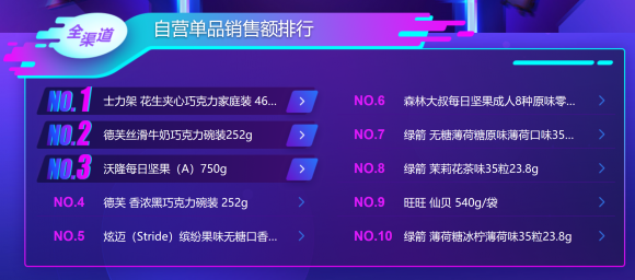 休闲零食方面,德芙、乐事和百草味等我们熟知的品牌位列榜单前三,益达和绿箭这两个以口香糖而知名的品牌,位列第四和第五;单品方面,我们可以看到巧克力、口香糖、坚果和仙贝等产品,并且口味也非常丰富,满足消费者的不同需求。