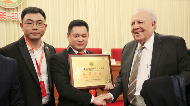【摘要:联合国国际科学与和平周第三十届开幕式暨中社丝路文化传承基金揭牌仪式于2018年11月11日下午在京举行。中润国力集团董事局主席、总裁马壹,总经理樊明明受邀出席,马壹获得“和平使者”称号。】