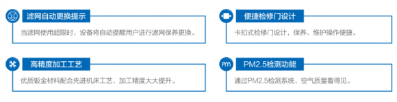 多重贴心设计,清新又安心:滤网自动更换提示、便捷检修门设计、高精度加工工艺、PM2.5检测功能