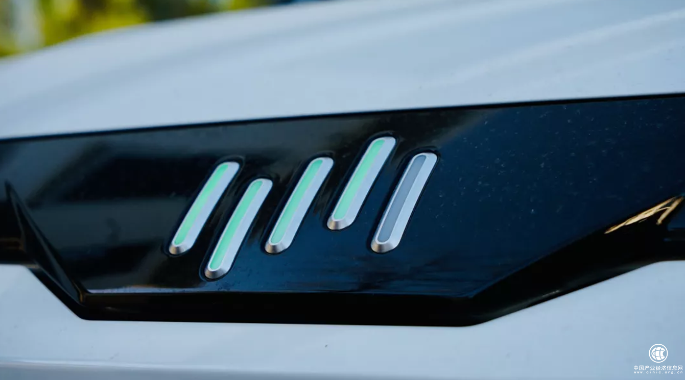 LED作为全系标准的配置,也为威马的整体气息提了不少神韵;前脸部位,比较有创意的地方还有这个车标,如果说现在车辆的智能程度,能追得上手机一点儿都不假了,因为这个车标在充电的时候,能够像手机的电量进度条一样闪烁,有几条亮,说明电量到了多少。