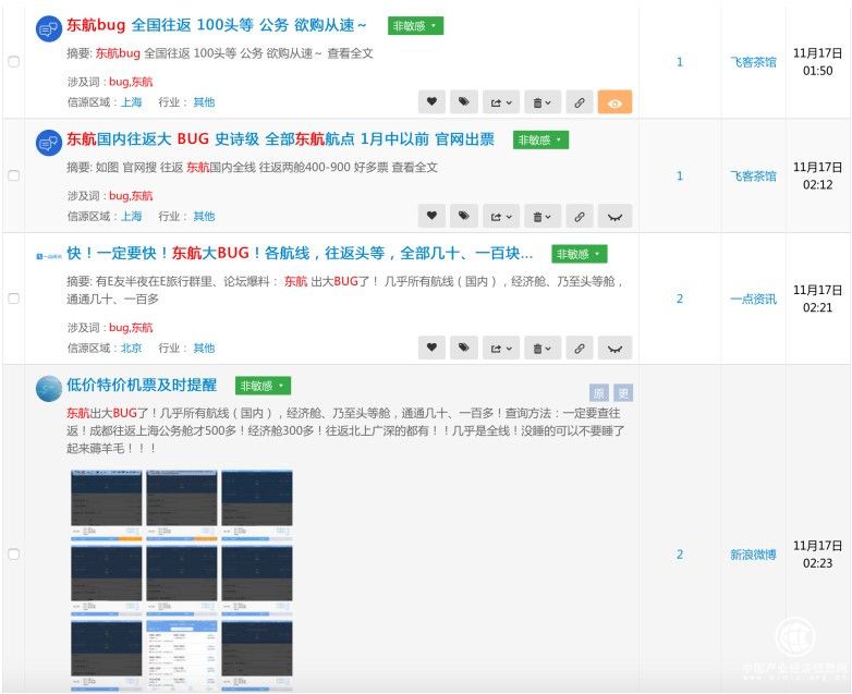 据新浪舆情通全网信息监测,对全网11月17日至21日与“东航bug”相关的信息进行采集后发现,2018年11月17日凌晨1时50分,“东航bug”相关的全网首条信息出现在飞客茶馆上,随后一点资讯、微博等平台上也开始陆续出现相关信息。