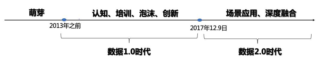 国内来看,从2013年到2017年12月9号,属于数据1.0时代,是进行认知、培训、泡沫、创新的过程。为什么以2017年12月9号为分界点呢?因为在这一天梅宏院士向中央递交了一个报告,从此整个行业进入了数据2.0时代,也就是数据场景化应用、深度融合的时代。