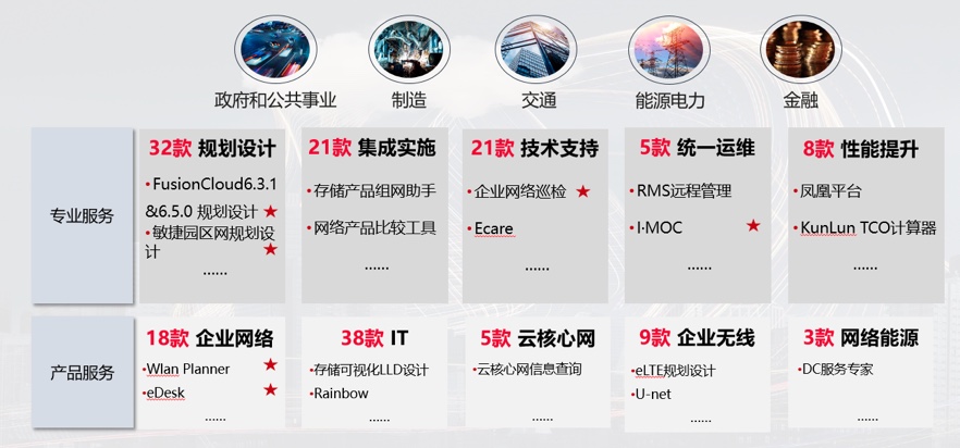 ServiceTurboCloud是开放的一站式服务工具云平台,涵盖网络、云核、无线、网络能源等全产品生命周期服务,如网络产品工具eDesk、IT产品工具eService/Toolkit等;面向规划设计、实施、迁移、维护、优化和运维等专业服务场景,提供跨产品融合的专业服务工具,如云DC设计、网络性能评估优化工具等;针对行业场景提供匹配行业业务特色的作业工具,如平安城市IVS站点设计、智慧城市eLTE设计等。ServiceTurboCloud是端到端的工具应用市场,以集成交付平台的方式形成工具链,不仅打通数据流、减少数据转换,还以“现场+远程协同”的交付模式让企业服务标准化作业成为可能。