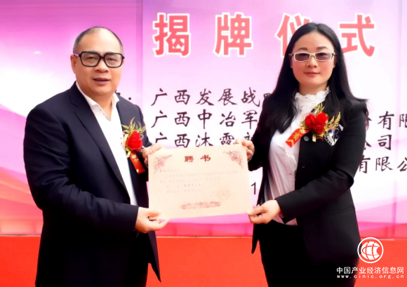 (图为江东洲会长[左一]为鲁艳霞董事长[右一]颁发孔雀西南飞广西新能源产业人才基地理事长聘书。)
