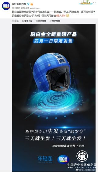 2019年脑白金推出的是程序员专用生发头盔。这个叫“脑发金”的头盔造型普普通通,却可以解决当代程序员最头疼的问题——脱发!带上3天就生发,还可定制程序员最爱的格子花纹。头发来之不易,真有这么好的东西?网友:求生产,求推广,骗人是小狗!