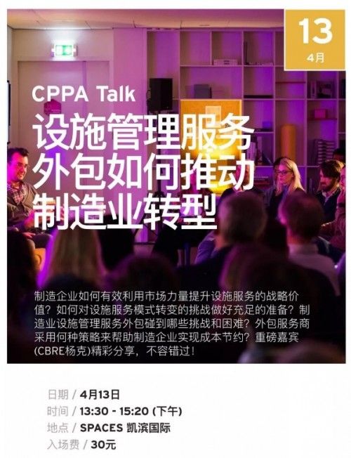 3月31日,首场CPPATALK在Spaces·凯滨国际顺利举行,活动邀请到了毕马威咨询运营咨询团队副总监秦浩先生担任嘉宾,和大家分享了企业在面对信息时代的冲击下,采购人员如何按照企业整体战略进行调整。本月13日,世邦魏理仕(CBRE)公司跨国企业服务部大中华区卓越运营平台董事、同济大学复杂工程研究院设施管理研究中心特聘专家杨克也将莅临Spaces·凯滨国际,带来关于企业设施管理的精彩演讲。