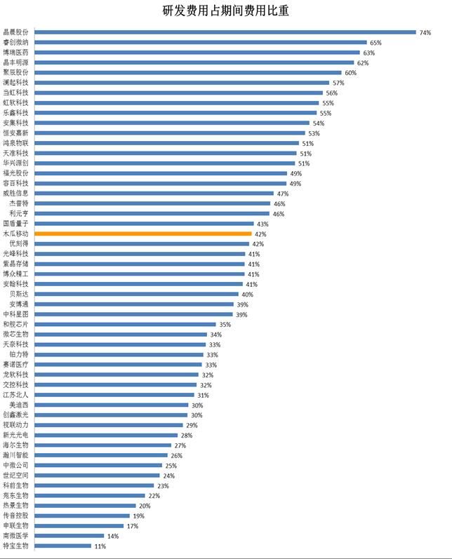 另外一个比较极端的例子是木瓜移动,研发占营收比为1%,在50家企业中排最末位。然后在研发占毛利比排名中排第38位(16%),在研发占期间费用比排名中跻身第21位(42%),超过多数其他的被受理企业。那么用1%的研发占营收比去评价木瓜移动的研发投入,显然是非常不科学和有失偏颇的。